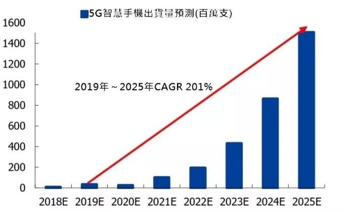 根据Strategy Analytics预测5G智能手机出货量将从2019年的200万台增加到2025年的15亿台,年复合增长率为201%。