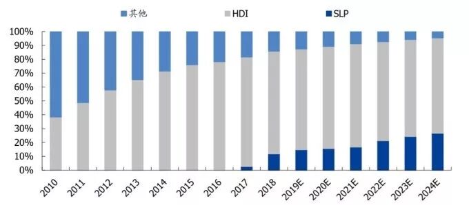 带领这项技术风潮就是Apple,从iPhone 8 及iPhone X 开始,iPhone 采用线宽线距更小的SLP 技术,引领HDI 市场朝向类载板发展。